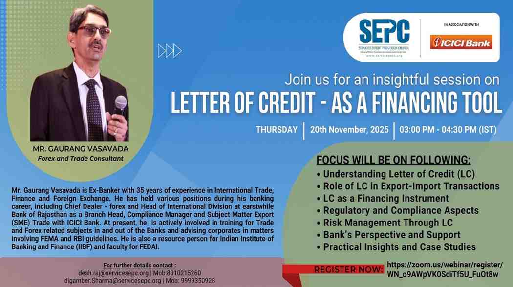 Services Export Promotion Council, set up by Ministry of Commerce and Industry has been mandated to facilitate global business opportunities for India’s services sector. Since its inception in 2006, SEPC has following broad roles and responsibilities.